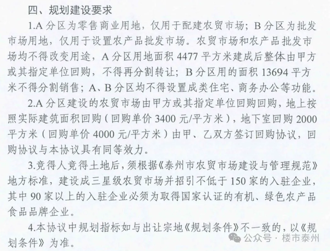 A分区用地面积4477平方米建成后整体由甲方或其指定单位回购,不得再分割转让;地上按照实际建筑面积回购(回购单价3400元/平方米),地下室回购2000平方米(回购单价4000元/平方米)。