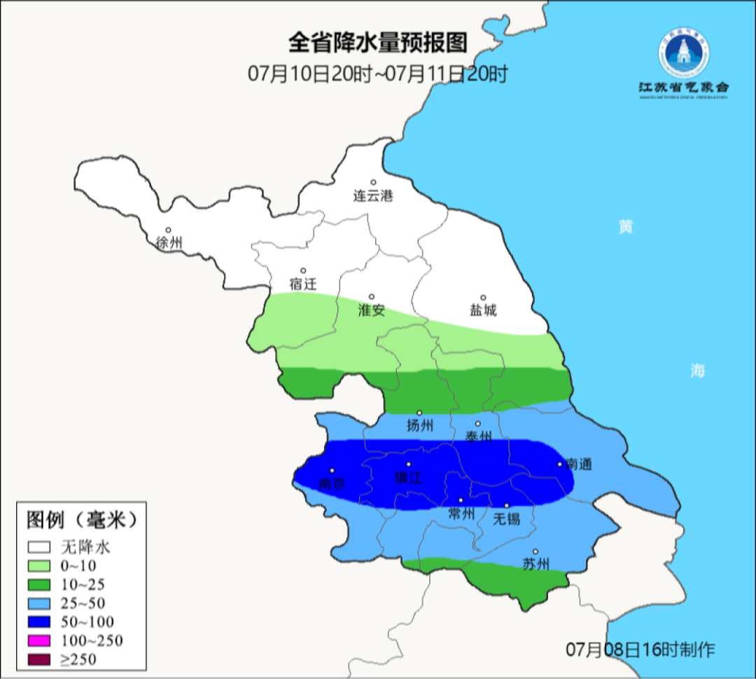 江苏省气象台昨天15时51分发布暴雨蓝色预警
