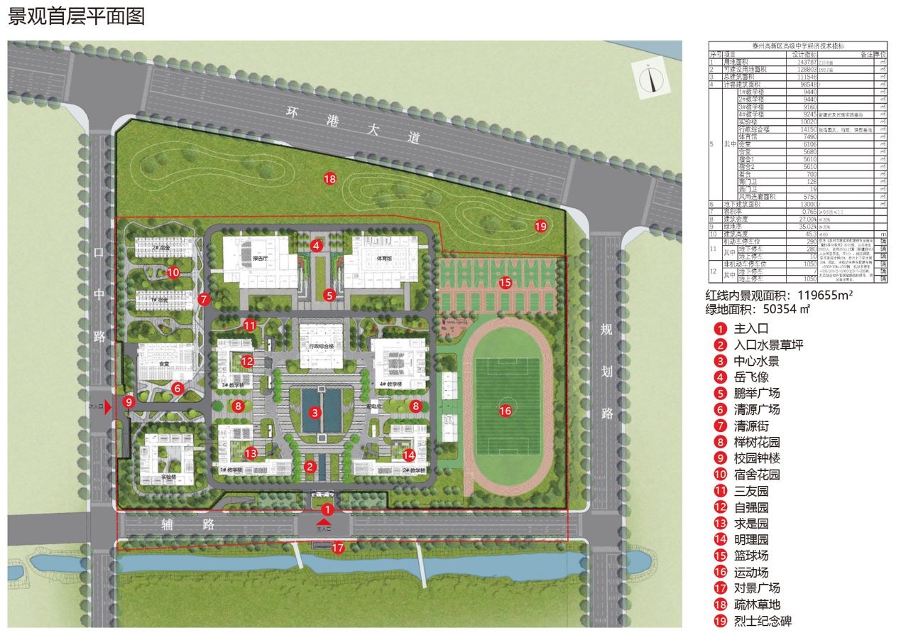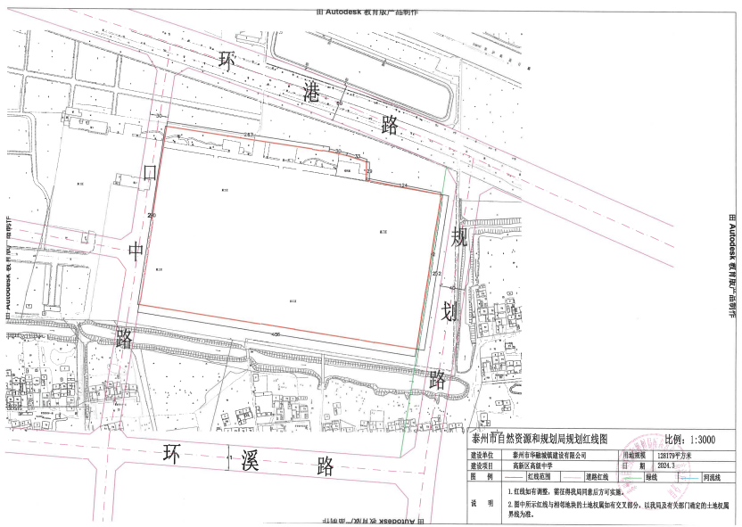 根据项目建设用地规划许可证,高新区高级中学工程项目位于泰州市高港区许庄街道曹官营社区境内,具体位置为医药高新区(高港区)环港大道南侧、高港大道东侧,泰州市港城驾驶员培训中心地块。用地总面积128179平方米,总建筑面积119000平方米,土地取得方式为划拨。