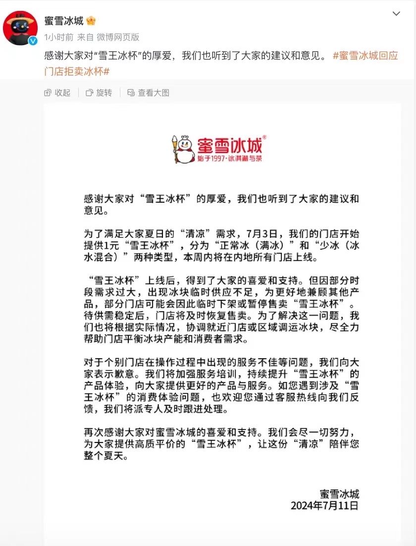 7月11日,蜜雪冰城就此事发文致歉,表示待“雪王冰杯”供需稳定后,门店将及时恢复售卖。