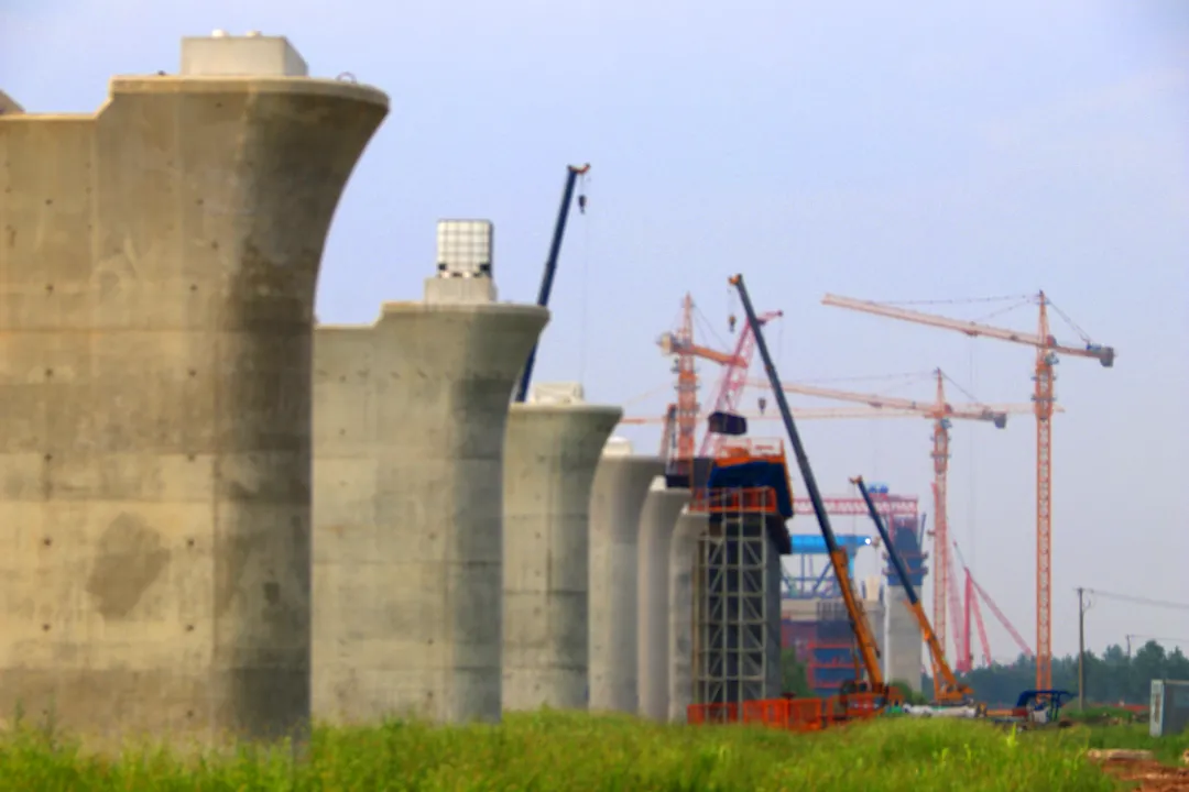 目前,沪渝蓉高铁泰兴段施工进展顺利,桥梁桩基、承台施工已基本完成,墩身施工完成约70%。