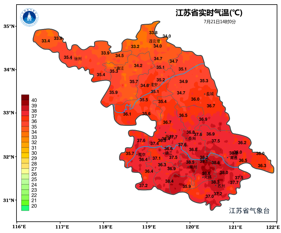 淮北地区多云有时阴,其他地区多云到晴。最高温度:江淮之间南部和苏南地区37~38℃,其他地区35~36℃。最低温度:全省28~29℃。全省偏南风4-5级阵风6级。