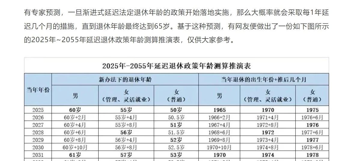根据上述自媒体公众号文章介绍,这一结论来自于一张《退休年龄对照表及相关规定》和《2025年-2055年延迟退休政策年龄测算推演表》。那么这个表有官方依据吗?