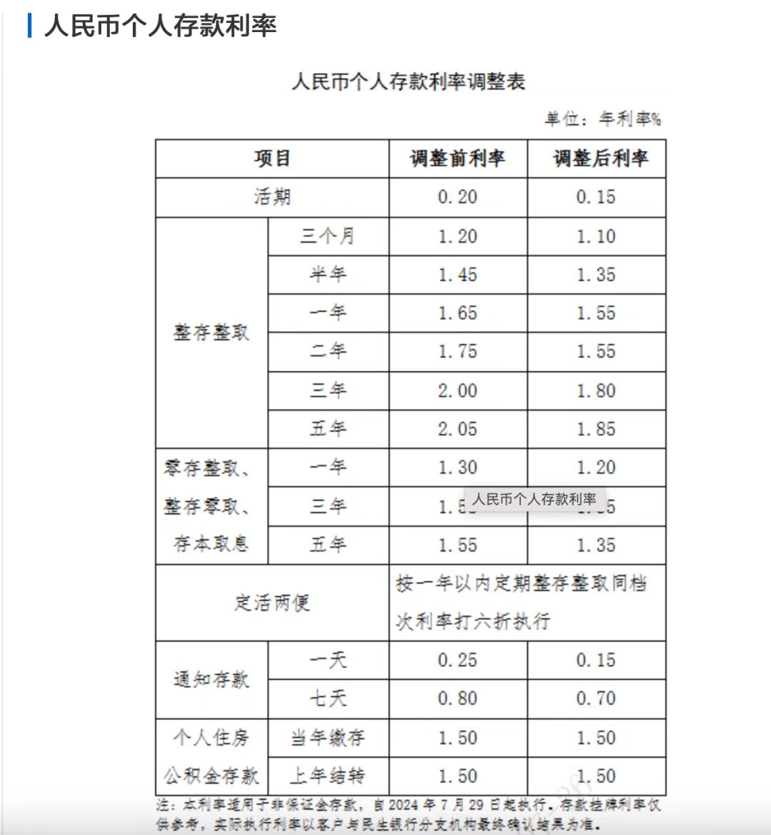 民生银行一年期、两年期、三年期和五年期人民币定期存款利率分别降至1.55%、1.55%、1.80%、1.85%。