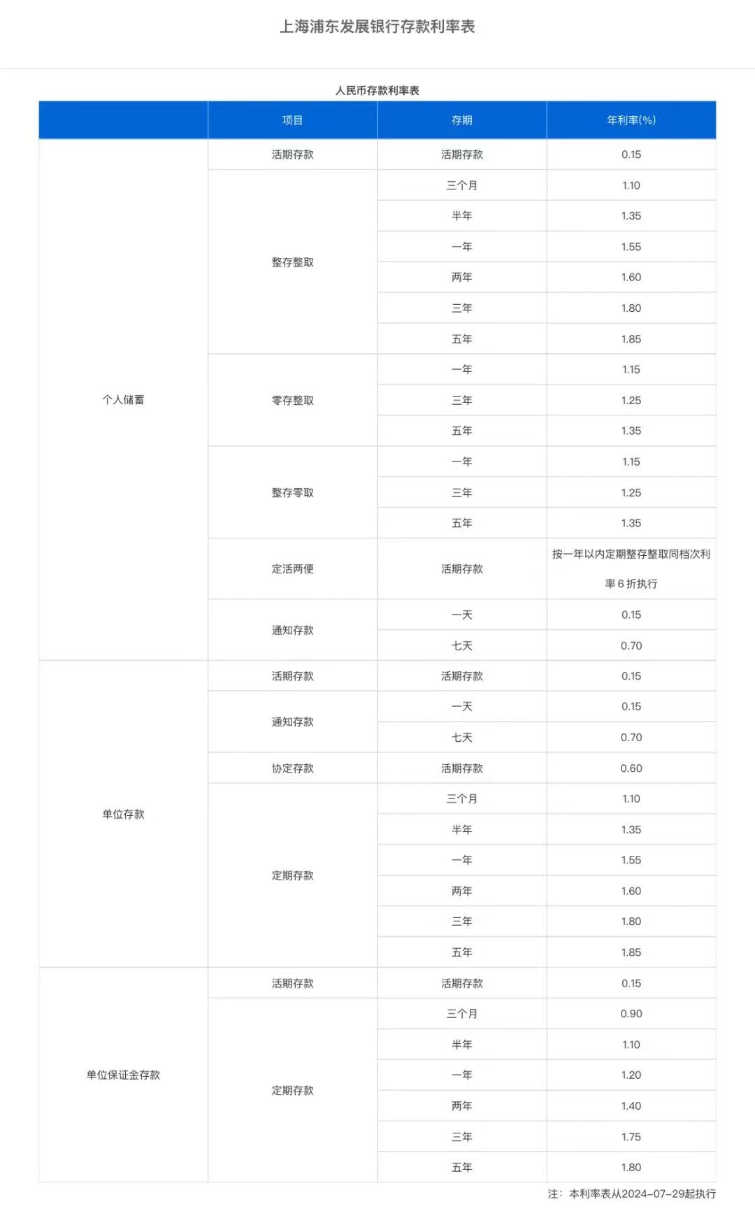 浦发银行一年期、两年期、三年期和五年期人民币定期存款利率分别降至1.55%、1.60%、1.80%、1.85%。