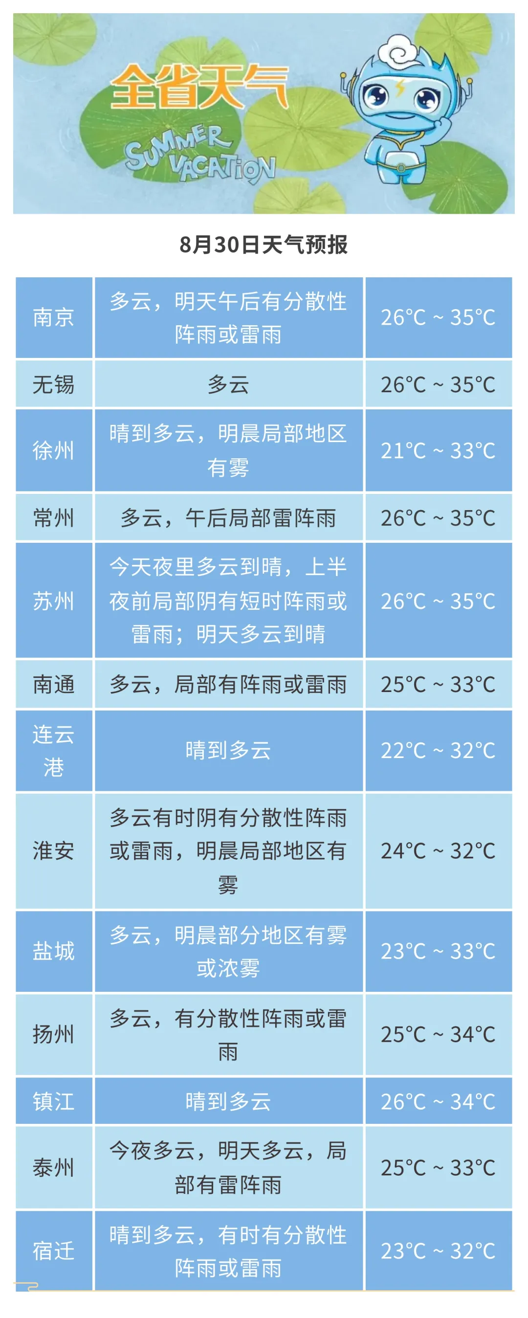 8月29日20时到8月30日20时:全省多云。最高温度沿江和苏南地区33~34℃,其他地区32℃左右;最低温度沿淮和淮北地区21~22℃,苏南南部地区26~27℃,其他地区24℃左右。全省偏东风4级左右。