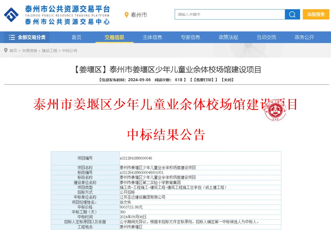 9月6日,泰州市公共资源交易平台发布《泰州市姜堰区少年儿童业余体校场馆建设项目》中标结果公告,江苏圣达建设集团有限公司9003723.86元中标。