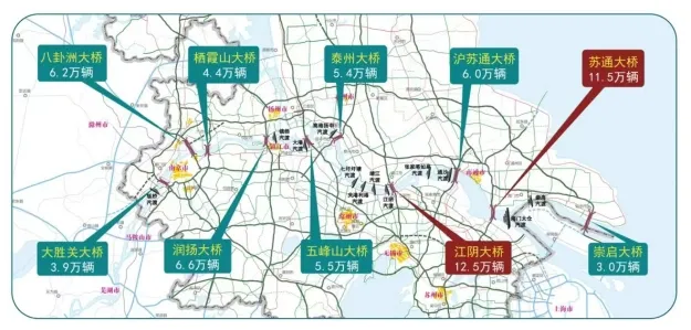 高速公路 根据预测,中秋期间,江阴大桥、泰州大桥日均流量将分别达到12.5万辆和5.4万辆。节前一天下午及假期首日上午单向车流集中,其中江阴大桥靖江方向8时至11时与江阴方向16时至20时预计出现车多缓行现象。