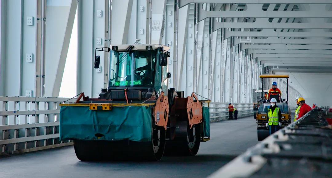 针对不同的行车区域,建设团队采用了8种铺装结构和铺装体系。其中,上层桥面采用热拌环氧沥青铺装体系,以提升路面耐久性和行车舒适度;下层桥面采用冷拌高韧树脂铺装体系,以适应无光照施工环境和公铁同面振动的影响。全面采用了国产高温拌合型环氧树脂、两阶段固化型环氧树脂防水粘结剂和高韧冷拌树脂,有效推动国内相关企业铺装材料关键核心技术研发达到国际领先水平,打破了我国钢桥面铺装用环氧树脂依赖进口的局面,实现了国产材料在千米级超大跨径桥梁钢桥面铺装的应用。