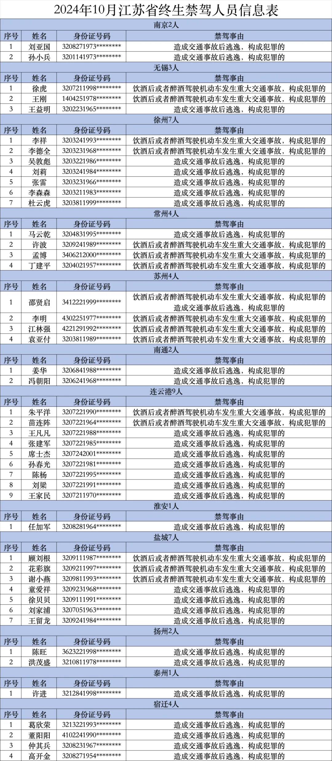2024年10月全省终生禁驾人员名单