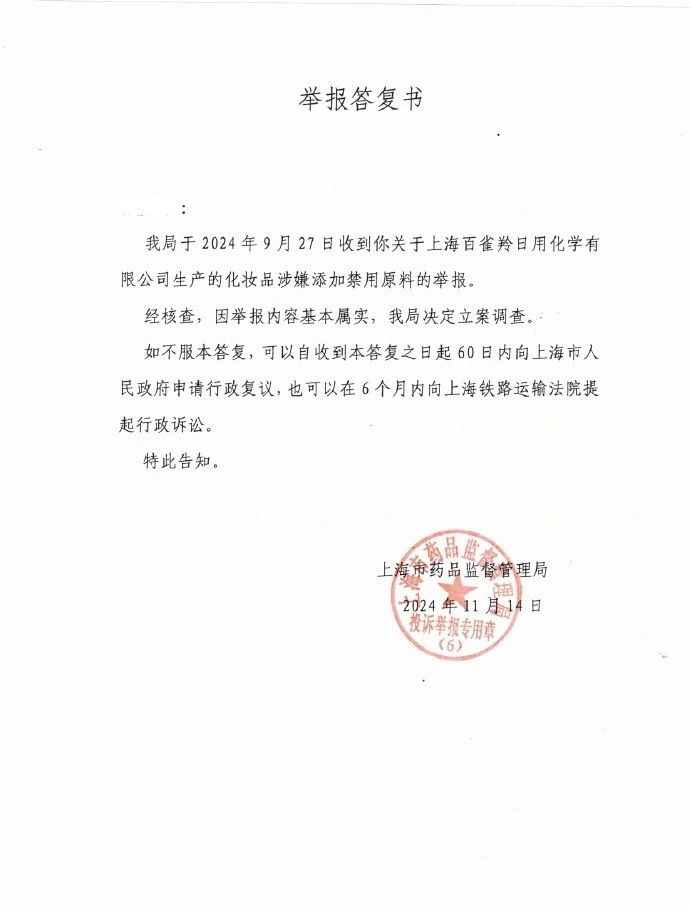 我局于2024年9月27日收到你关于上海百雀羚日用化学有限公司生产的化妆品涉嫌添加禁用原料的举报。