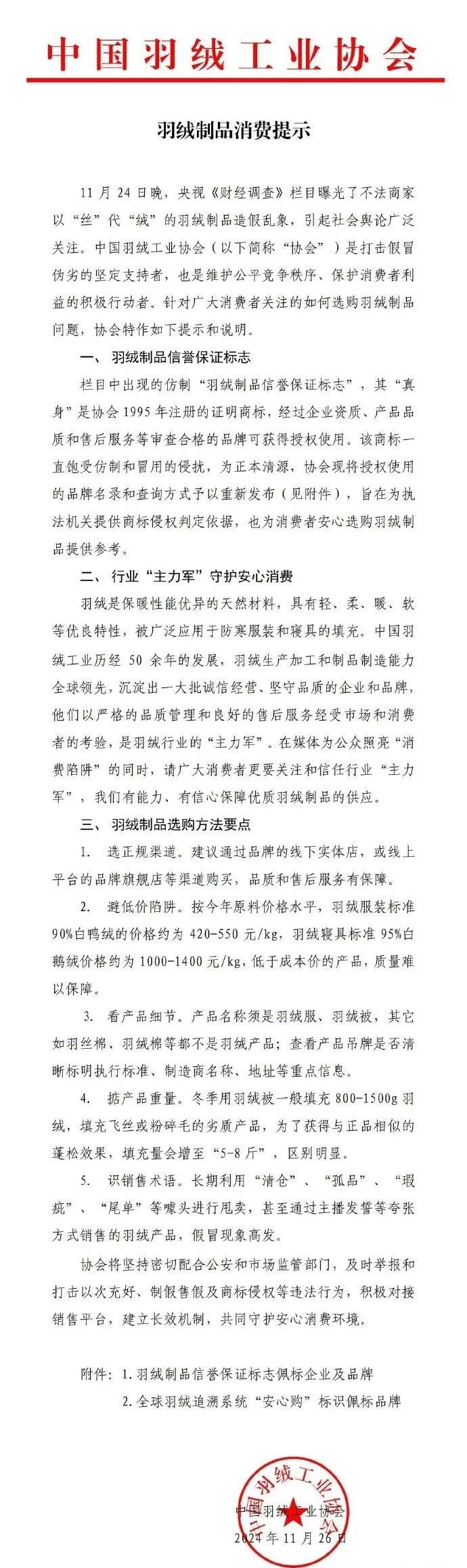 11月26日,中国羽绒工业协会就近期羽绒制品造假乱象发声并发布《羽绒制品消费提示》。