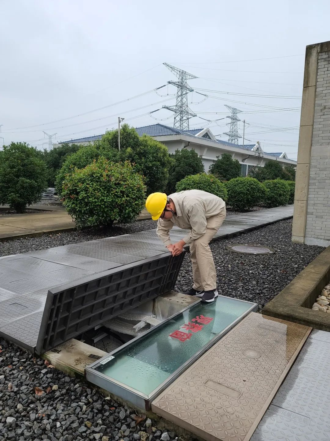 9月16日上午 500千伏变电运检中心凤城变值班员 趁着台风“贝碧嘉”还未进入江苏前 抢抓时间检查站内排水系统 和电缆沟积水情况
