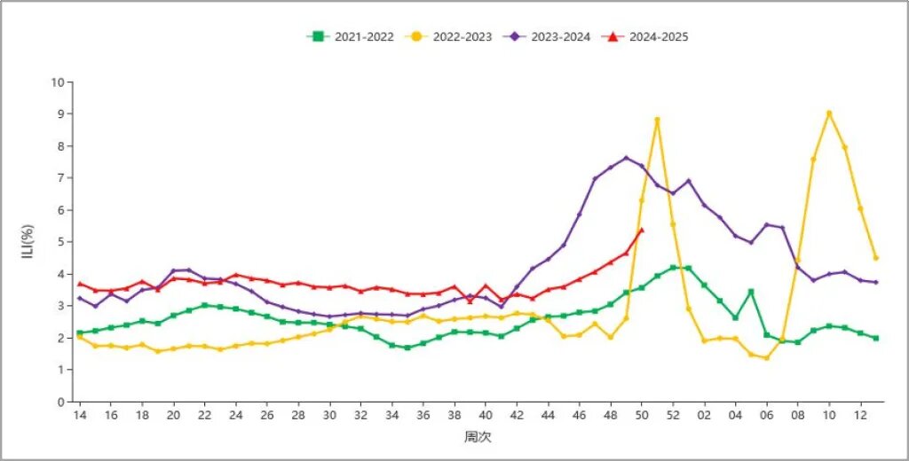 此外,《中国流感监测周报》报告显示,南、北方省份流感病毒检测阳性率继续上升,第50周南方省份哨点医院报告的ILI%(流感样病例百分比)为4.0%,高于前一周水平(3.6%),低于2021-2023年同期水平(4.1%,9.2%和 9.1%)。北方省份哨点医院报告的ILI%为5.4%,高于前一周水平(4.7%),高于2021年同期水平(3.6%),低于 2022-2023年同期水平(6.3%和7.4%)。