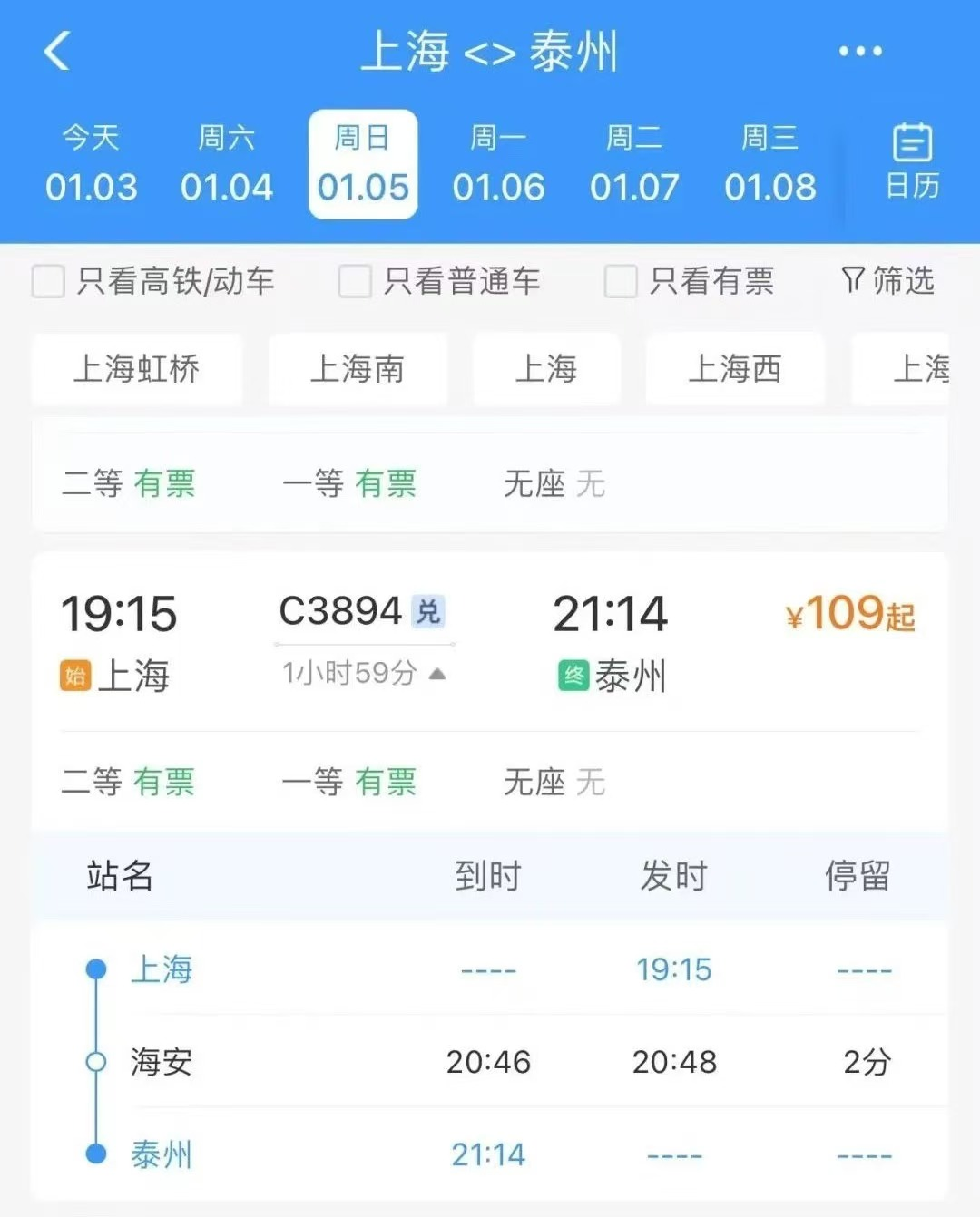 据介绍,目前,泰州至上海的C3895次列车,13:50从泰州站出发,16:22到达上海站,运行时间为2小时32分,停靠站点分别为:海安、南通西、张家港、常熟、太仓、安亭西、上海西、上海;回程的C3894次列车,19:15从上海站出发,21:40到达泰州站,运行时间为2小时25分,停靠站点分别为:安亭西、太仓、张家港、如皋、海安、泰州。
