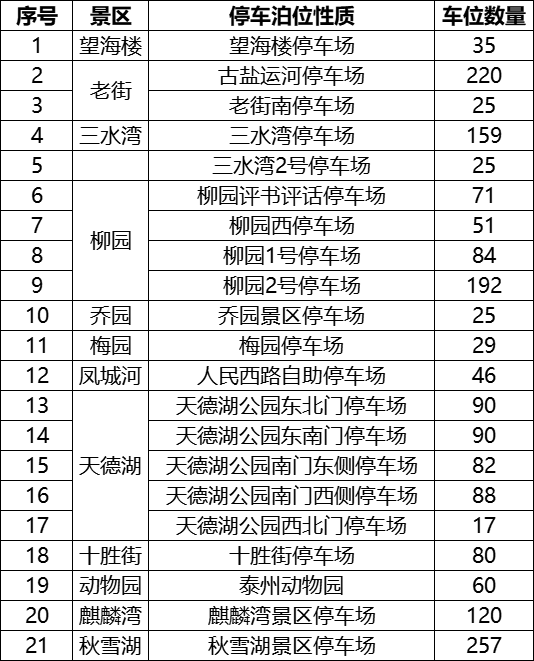 据介绍,除夕至正月初四,主城区8000余个道路停车泊位将全部免费,具体的免费停放时间为1月28日0:00至2月1日24:00。此外,将免费开放景区停车场,涉及泰州12个重点景区周边的21个停车场,共有停车泊位1846个。免费停放时间为1月28日0:00至2月4日24:00(除夕至正月初七),详见下表。