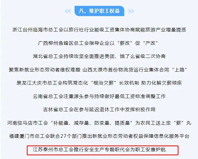 泰州市总工会 推行安全生产专题职代会 为职工安康护航 入选 全国工会重点工作创新案例 全国工会重点工作创新案例发布 (2024年第9期) 日前,全国总工会发布2024年第9期全国工会重点工作创新案例,泰州市总工会推行安全生产专题职代会为职工安康护航入选。
