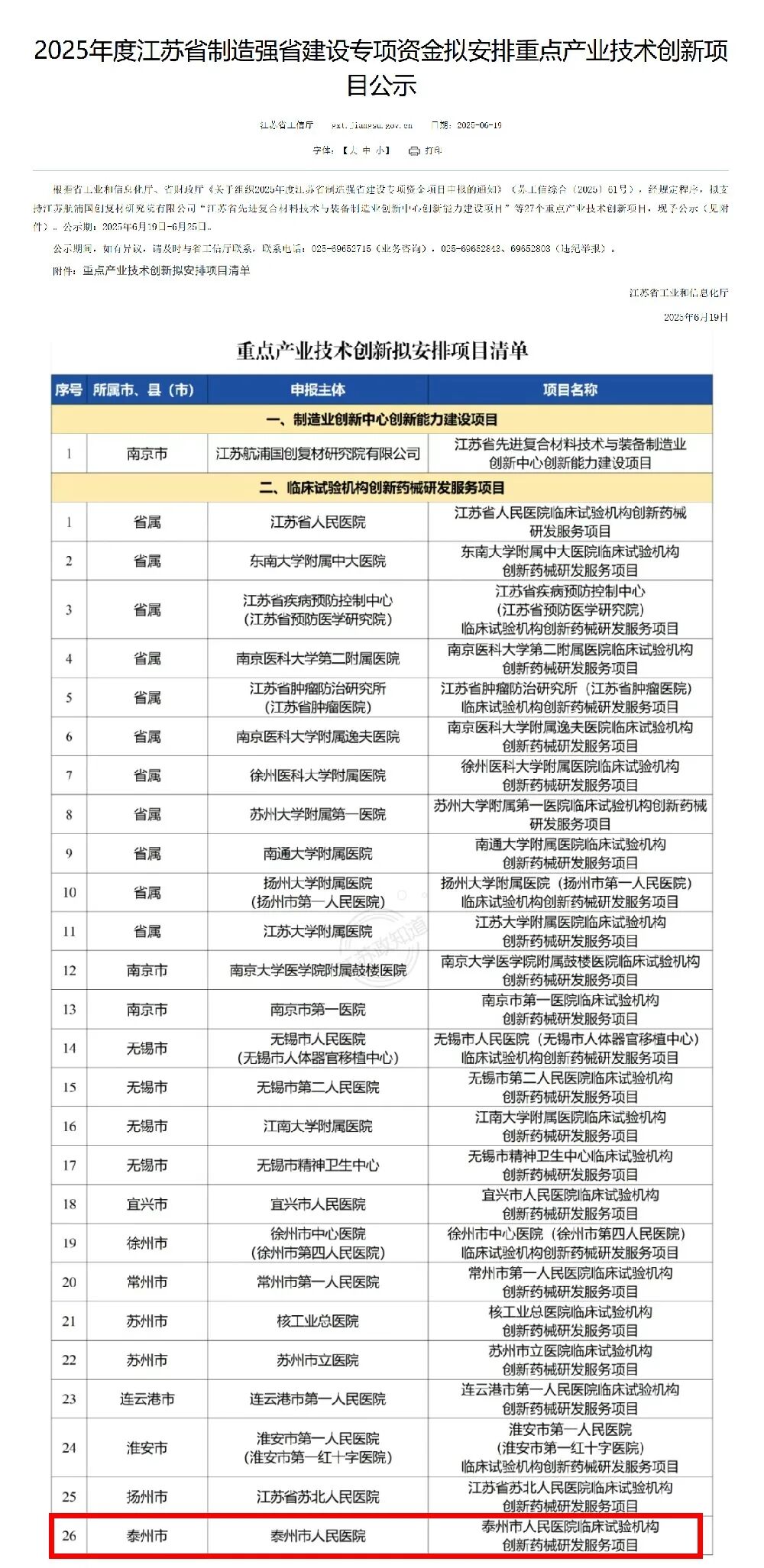 我院药物临床试验机构凭借在临床试验领域的创新服务能力,荣获2025年度江苏省工业和信息化厅“江苏省制造强省建设专项资金重点产业技术创新项目”——“临床试验机构创新药械研发服务项目”。我院是泰州地区获得该项目的首家医疗机构。