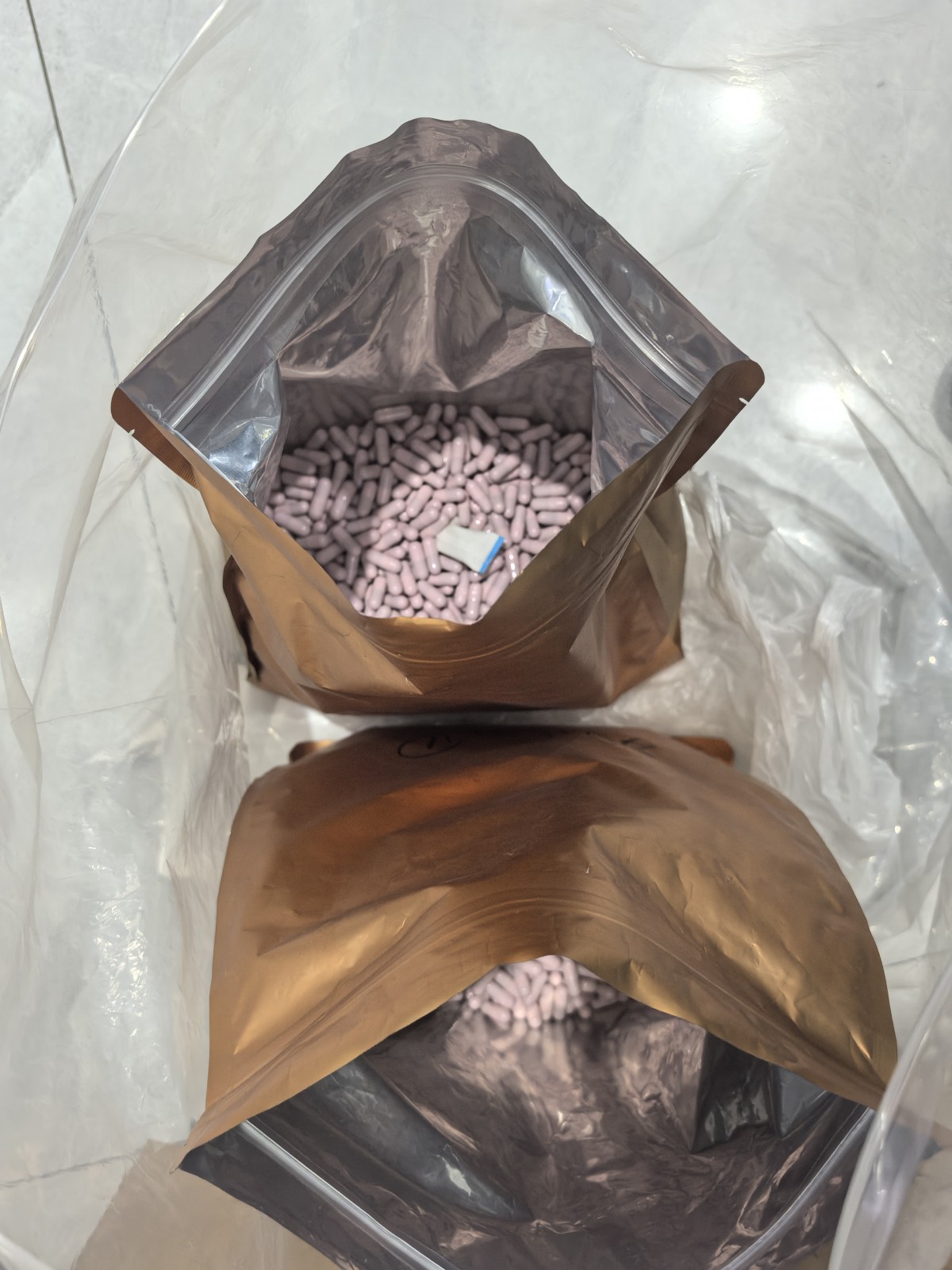 没过多久,刘某收到了“货”,两个大袋子里装着散装的减肥胶囊,一袋子里大约装着5千粒左右,胶囊都是几千颗杂乱地散装在一起,没有独立包装,包装袋上也没有任何生产信息。刘某在快递箱里翻找,只看到一张打印的卡片,上面写着“注意事项”,还特意标了几个红箭头,具体内容是哺乳期、孕妇、未成年小孩、有基础疾病的、年纪大的、高血压、生理期的人不能吃,一天吃一粒,晚饭后服用,空腹不能服用。