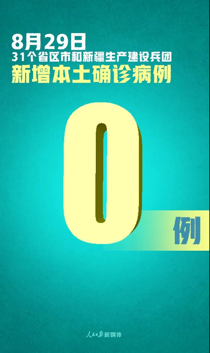 8月29日0—24时,31个省(自治区、直辖市)和新疆生产建设兵团报告新增确诊病例9例,均为境外输入病例(上海3例,福建2例,四川2例,天津1例,广东1例);无新增死亡病例;无新增疑似病例。
