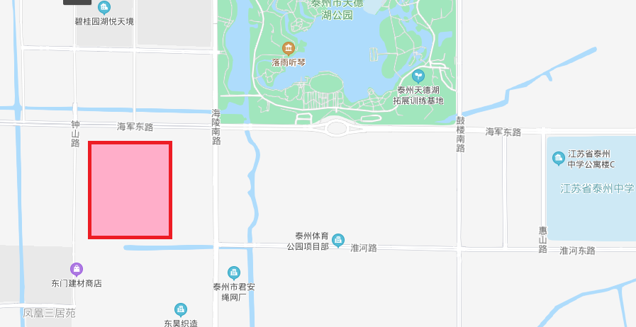 从地图上看,该地块位于泰州市天德湖公园的西南角,北侧是恒大华府和碧桂园湖悦天境,东侧是泰州体育公园。