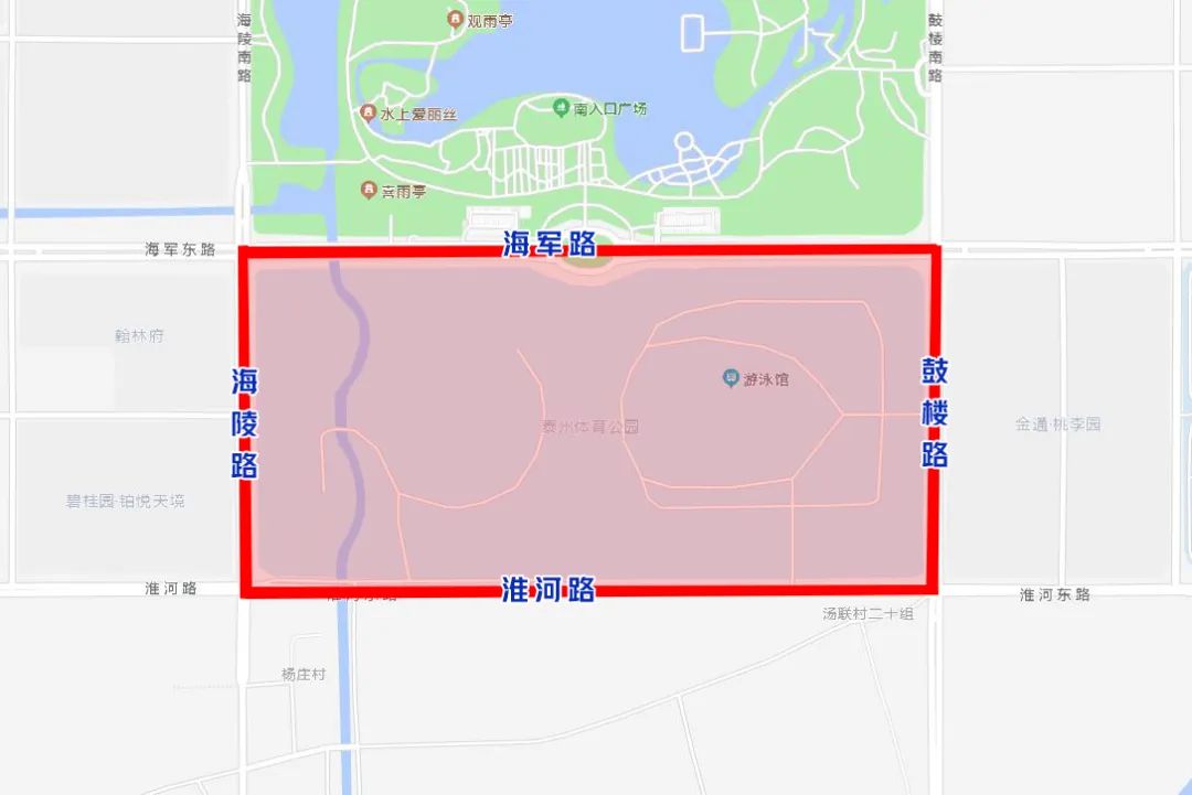 鼓楼路(含)、海军路(含)、海陵路(含)、淮河路(含)合围区域。