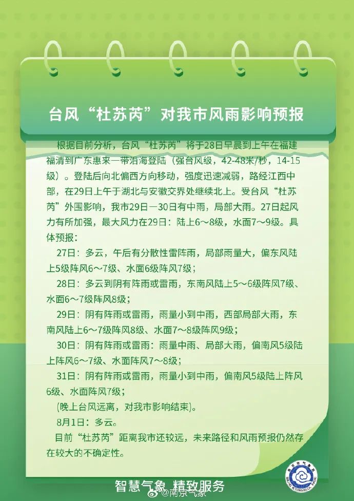 南京市气象台7月26日16时49分最新消息:受台风“杜苏芮”外围影响,南京7月29日—7月30日有中雨,局部大雨。27日起风力有所加强,最大风力在29日:陆上6~8级,水面7~9级。