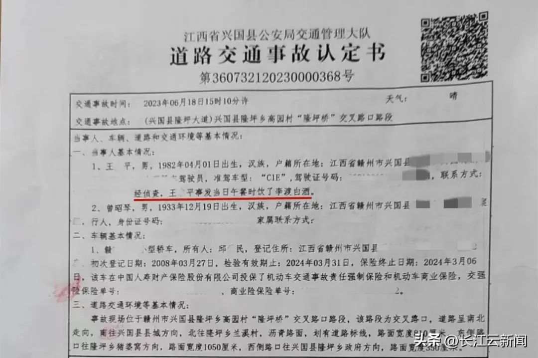 兴国县公安局交通管理大队出具的《道路交通事故认定书》也印证,经侦查,肇事者王某平在当天事发前的午餐,曾喝过白酒。但是,由于王某平是在次日凌晨才投案自首,此时抽取的血液中并未检出酒精成分。《道路交通事故认定书》还认定,王某平酒后驾驶,且在事故发生后驾车逃离现场,未报案也未保护现场,对事故负全部责任。