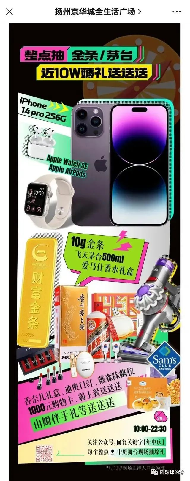 这件事发生在江苏扬州一家名为京华城的商场里。 7月29日,这家商场举办了一场抽奖活动,奖品包括10克金条、500毫升飞天茅台、爱马仕香水礼盒等。 据商场公众号发布的文章显示,抽奖活动从上午10点开始,每隔一个小时抽一次奖,一直持续到晚上10点半。 抽奖活动要求中奖者必须现场领奖,否则视为弃奖。
