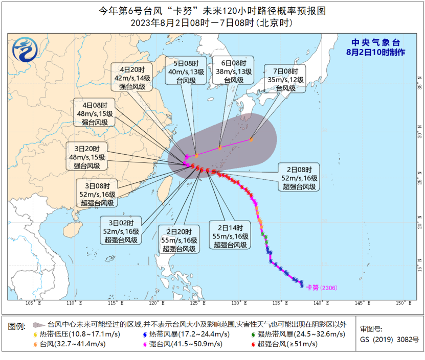 今年第6号台风“卡努”(KHANUN)(超强台风级)的中心今天(2日)下午14点钟位于北纬26度、东经126.1度,中心附近最大风力有16级(50米/秒),中心最低气压为940百帕。