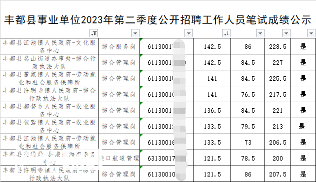 丰都县第一次公布的笔试成绩(来源:丰都县人民政府网站)