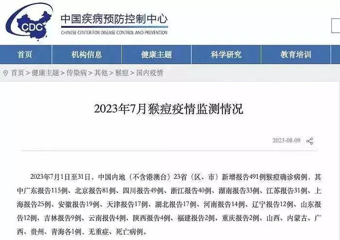 8月9日中国疾控中心发布2023年7月猴痘疫情监测情况其中江苏报告31例