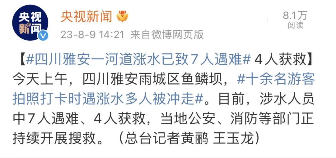 据央视新闻,8月9日10时左右,四川雅安雨城区鱼鳞坝网红打卡点十余名游客正在拍照打卡,突遇河道涨水,多人被洪水冲走,造成人员伤亡情况发生。目前,涉水人员中7人遇难、4人获救,当地公安、消防等部门正持续开展搜救。