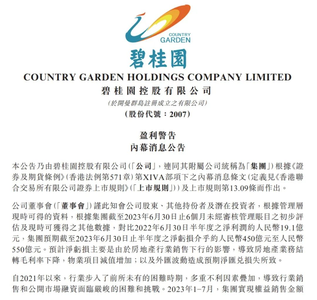 但7月31日,碧桂园公告称,根据公司截至2023年6月30日止6个月未经审核管理账目的初步评估及现在可获得的其他数据,对比2022年6月30日半年度的净利润约19.1亿元和股东应占核心净利润约49.1亿元,公司预期截至2023年6月30日止半年度可能录得未经审核净亏损。预计净亏损主要是由于房地产行业销售下行的影响,导致房地产业务结转毛利率下降,物业项目减值增加;以及外汇波动造成预期净汇兑损失所致。