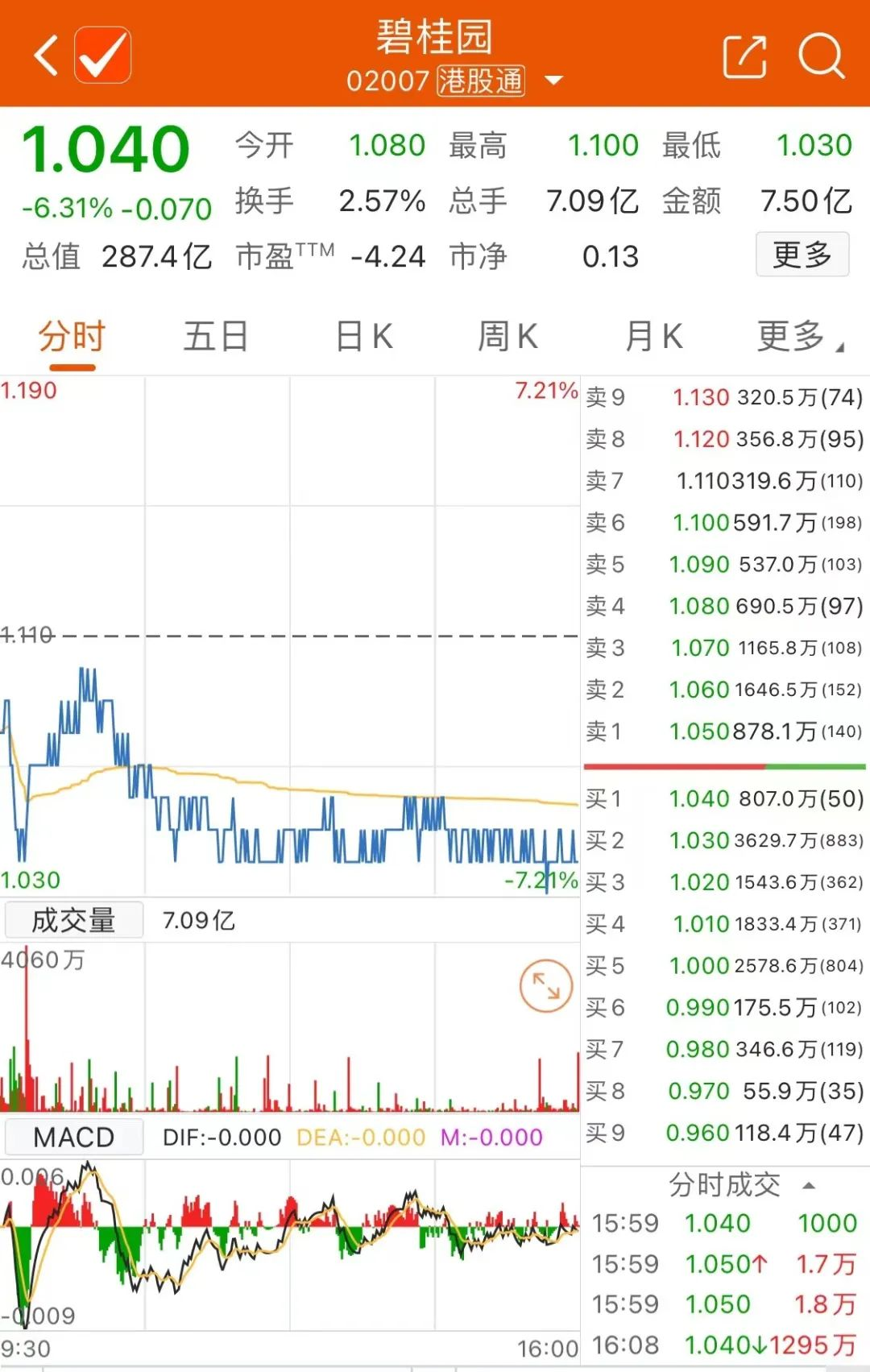 8月10日,港股碧桂园跌超6%,报1.04港元/股。总市值约为287亿港元。