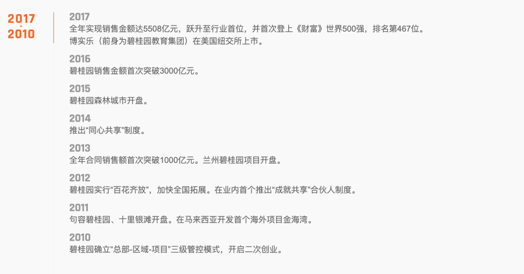 2017年,是碧桂园辉煌的一年。当年,碧桂园以5508亿元的合同销售额,首次问鼎年度销售冠军;万科及恒大则以5298.8亿元和5009.6亿元分列当年的二、三位。2017年前11个月,碧桂园的销售额已达5342.7亿元。除了持续拿地外,碧桂园2017年末在多项业务上均取得进展。同年,碧桂园首次登上《财富》世界500强,排名第467位。