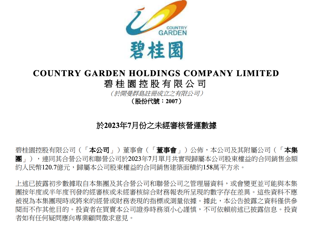 8月3日,碧桂园发布未经审核运营数据。7月,实现归属本公司股东权益的合同销售额约120.7亿元,归属公司股东权益的合同销售建筑面积约158万平方米。
