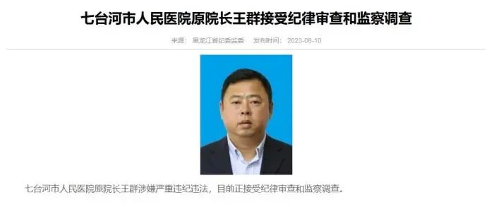 8月10日,黑龙江省纪委监委网站援引七台河市纪委监委消息称,七台河市人民医院原院长王群涉嫌严重违纪违法,目前正接受纪律审查和监察调查。