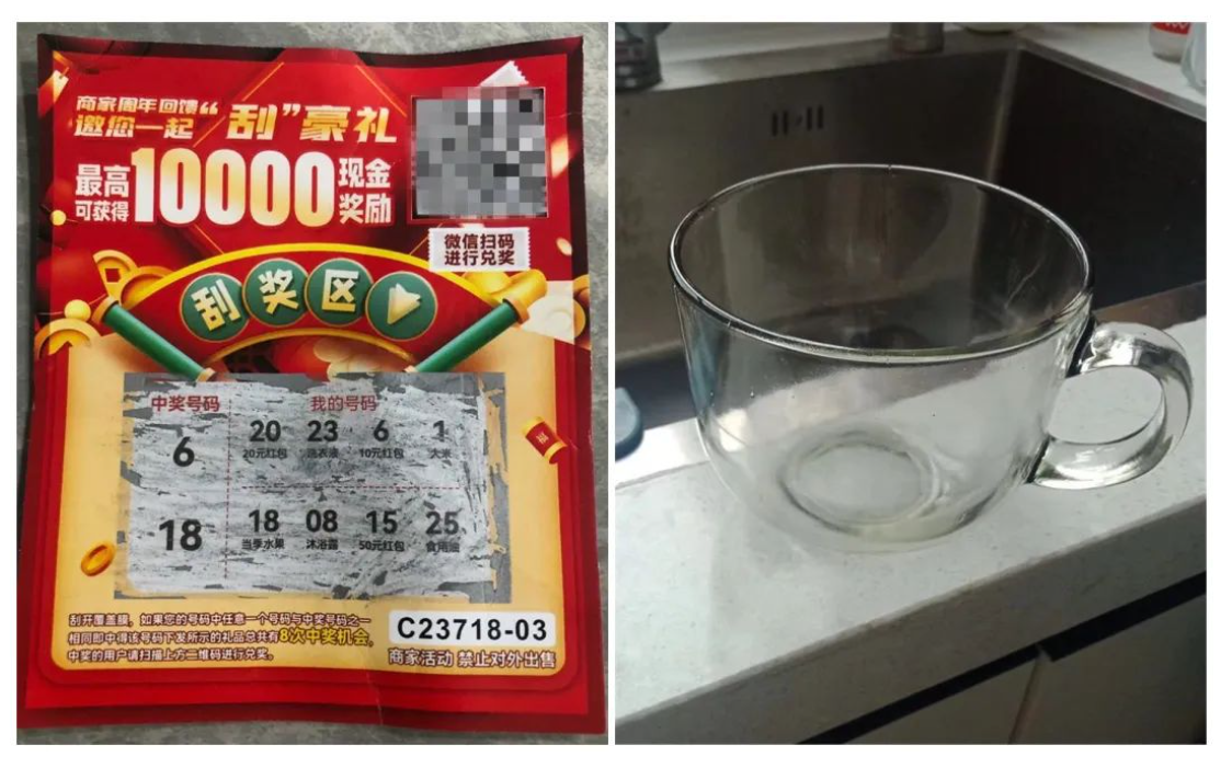 里面是一个赠送的玻璃杯和一张刮刮乐