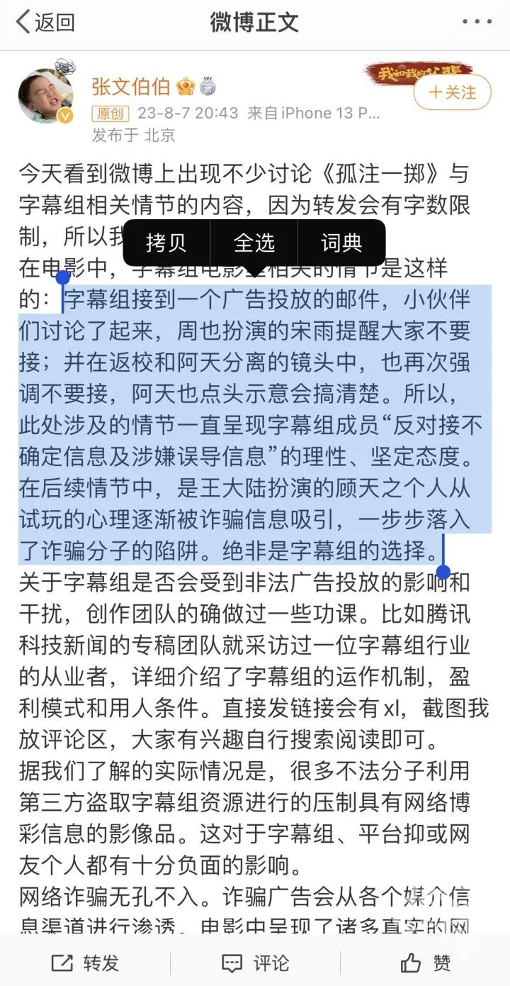 伊甸园字幕组的老大“邦德的那个猪”,14日下午在其个人微博上宣布,即日起伊甸园字幕组招募解散,不再出品任何字幕,并把矛头指向电影《孤注一掷》,认为编剧和导演没有仔细调查和了解字幕组,设定字幕组投放赌博广告的剧情,不符合真实事实。