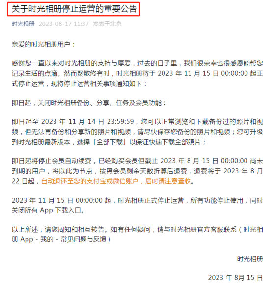 时光相册官方还表示,已经购买会员但截至2023年8月15日00:00:00尚未到期的用户,将以此为节点,按照会员剩余天数折算后退费。退费将于2023年8月22日起自动退还。