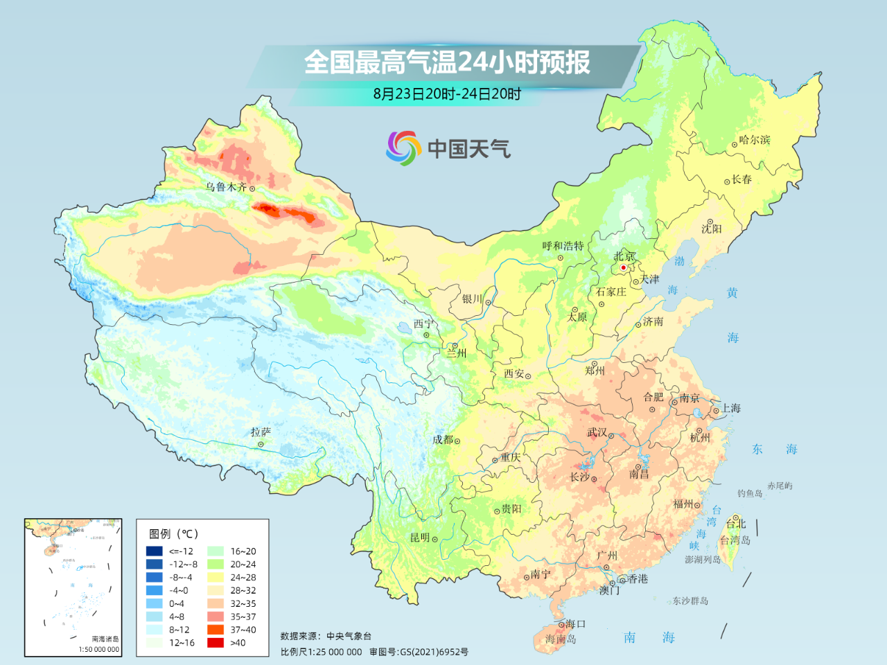 中国天气网预报: 25日开始 最高气温30℃以上的区域 会逐渐缩减到长江以南地区 预报图上的暖色调逐渐被冷色调替代