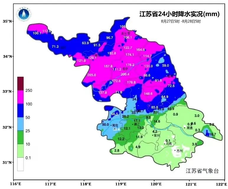 平静了多日的天气舞台要热闹起来了本周风雨来“串场”“小晴歌”改唱“落大雨” 27日05时-28日05时,宿迁、盐城、淮安等12个市的1255个乡镇(街道)的降水量达到10mm以上(占全省77.66%),宿迁、盐城、淮安等9个市的898个乡镇(街道)的降水量达到50mm以上(占全省55.57%),其中宿迁、盐城、淮安等7个市的450个乡镇(街道)的降水量达到100mm以上(占全省27.85%),前3位分别是宿迁宿城区屠园镇242.0mm、盐城阜宁公兴社区太平桥村230.8mm、宿迁泗洪梅花镇227.9mm。