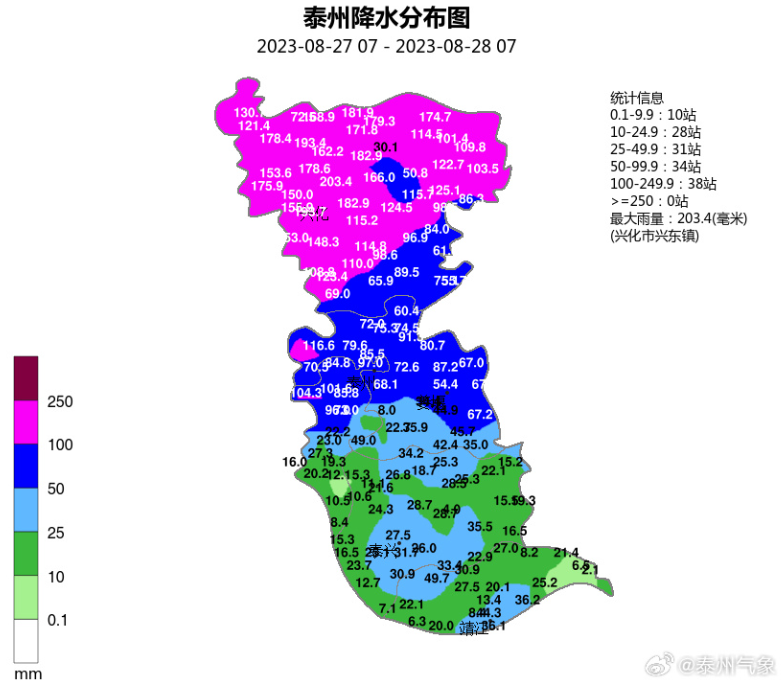 8月27日07时至28日07时,我市中北部地区出现暴雨,部分地区大暴雨,有72个站点降水量达到50毫米以上,其中有38个站点降水量达到100毫米以上,主要分布在兴化地区,最大降水量203.4毫米,出现在兴化兴东镇站。全市各地雨量:兴化150毫米、海陵97毫米、姜堰54.4毫米、靖江44.3毫米、泰兴27.5毫米、医药高新(高港)19.3毫米,最大小时雨强86毫米,出现在27日23时-28日00时的兴化垛田街道戴家站。