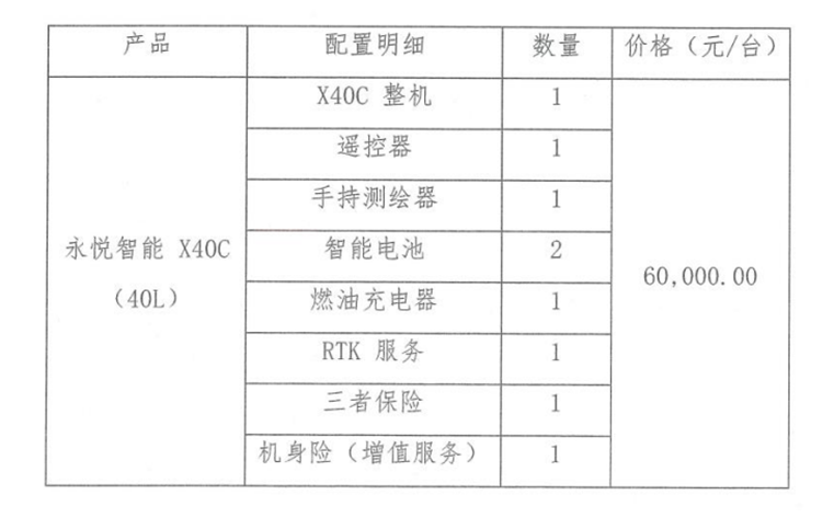 公告显示,本次拟交易的无人机产品为永悦智能X40C(40L),单台价格约为6万元,配置包括X40C整机、遥控器、手持测绘器、智能电池(2块)等。