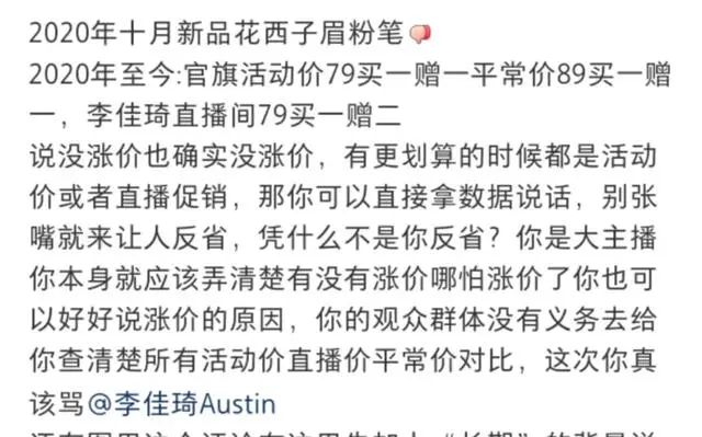 也有博主整理出该款眉笔往年的价格。该款眉笔为2020年新品,官旗活动价一直为79元买一赠一,平常价为89元买一赠一。在李佳琦的直播间79元买一赠二。