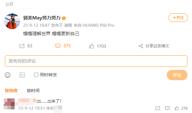 9月12日上午,停更两年半的郭美美的社交帐号突然更新了一条贴文:“慢慢理解世界,慢慢理解自己。”