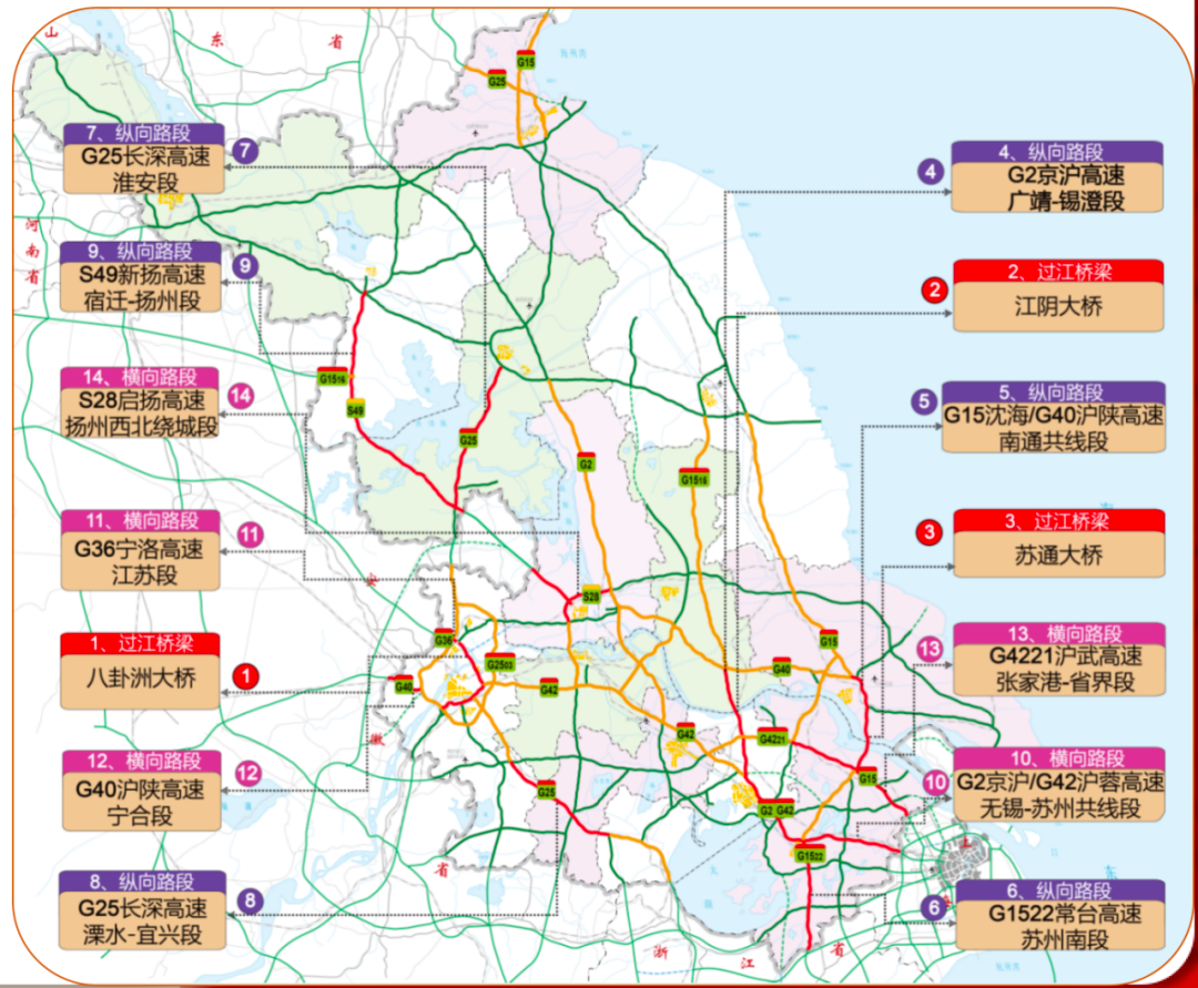 由北往南方向:江阴大桥,G2京沪高速扬州段,G15沈海高速盐城段,G25长深高速连云港、常州段,G1515盐靖高速盐城段,S49新扬高速淮安段。