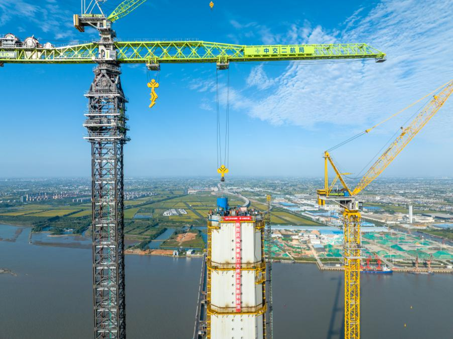 10月5日,随着上塔柱T9节段核芯混凝土浇筑完成,常泰长江大桥北主塔顺利封顶,标志着大桥成功攻克“钢箱-核芯混凝土”组合索塔锚固结构设计、施工各项技术难题,实现大桥“四个世界首创”第三项突破。