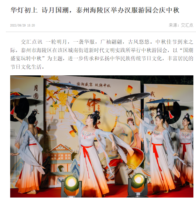 9月30日,新华网报道《泰州市海陵区启动“月圆中秋 梦圆中国”新时代文明实践集中活动日》。